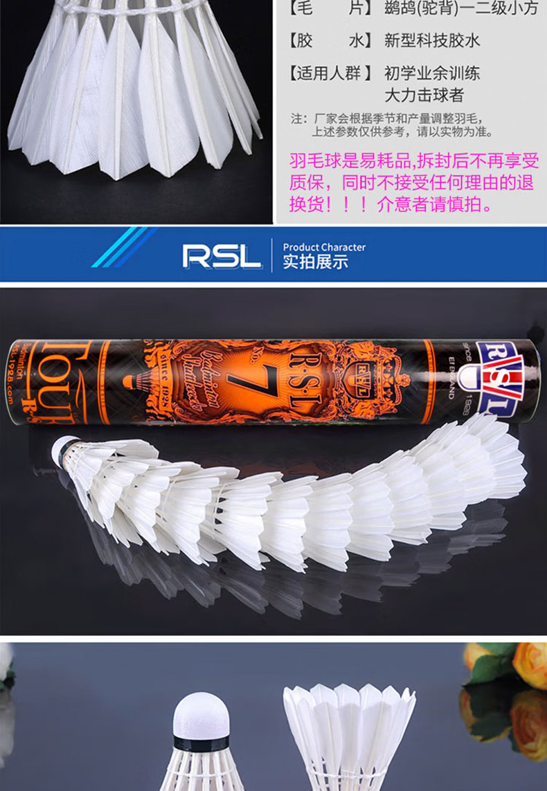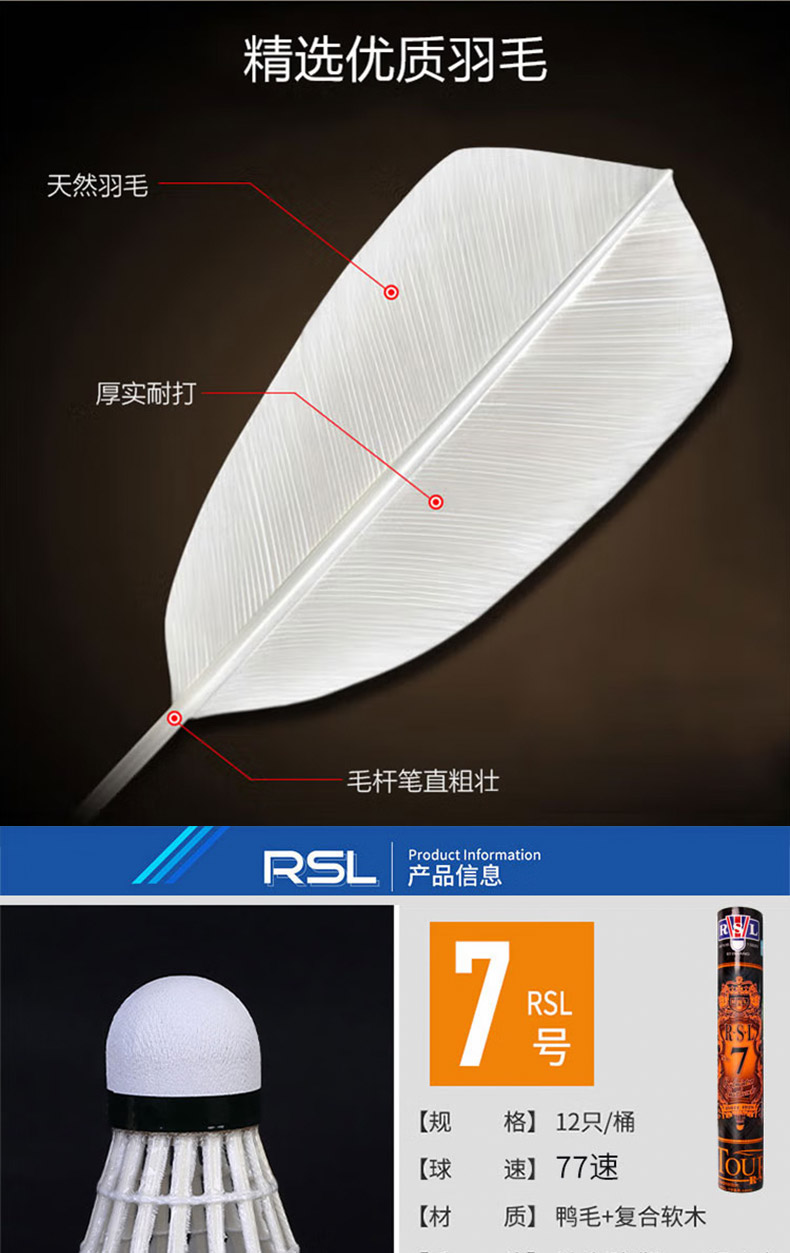 亞獅龍(RSL)羽毛球訓練比賽訓練用球穩(wěn)定耐打RSL7號77速鴨毛12只裝/桶